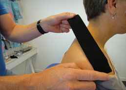 2 : Med let stræk ( Max 25 % ) lægges tapen op mod den nederste del af nakkerygsøjlen vej og trafik.
